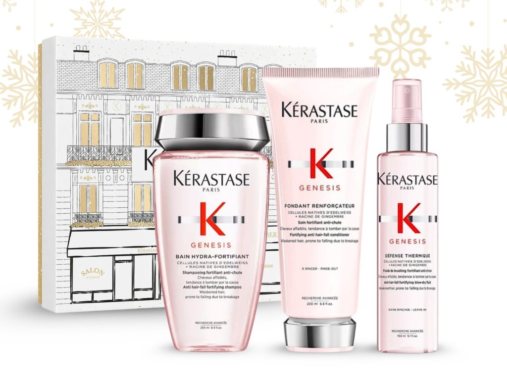 Dopřejte svým vlasům péči jako ze salonu. Kérastase Genesis Trio set je určen pro vlasy oslabované stresem, česáním a každodenním namáháním se sklonem k padání a zajišťuje okamžitě viditelné výsledky. Díky účinné kombinaci aminexilu, zázvorového extraktu a edelweiss vlasy posiluje, hydratuje a chrání před lámáním, aniž by je zatěžoval.